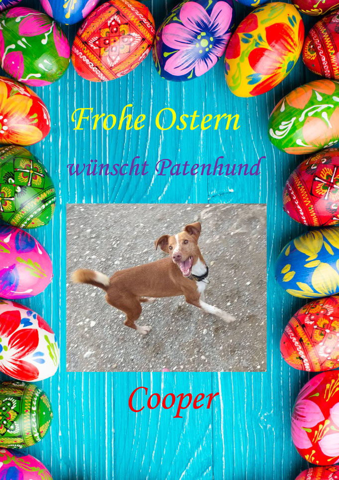 Cooper ist ein im Oktober 2011 geborener Podenco-Mix-Rüde mit einer Schulterhöhe von 50 cm. Er ist bereits kastriert und versteht sich gut mit Kindern, so dass diese in seinem neuen Zuhause, das
