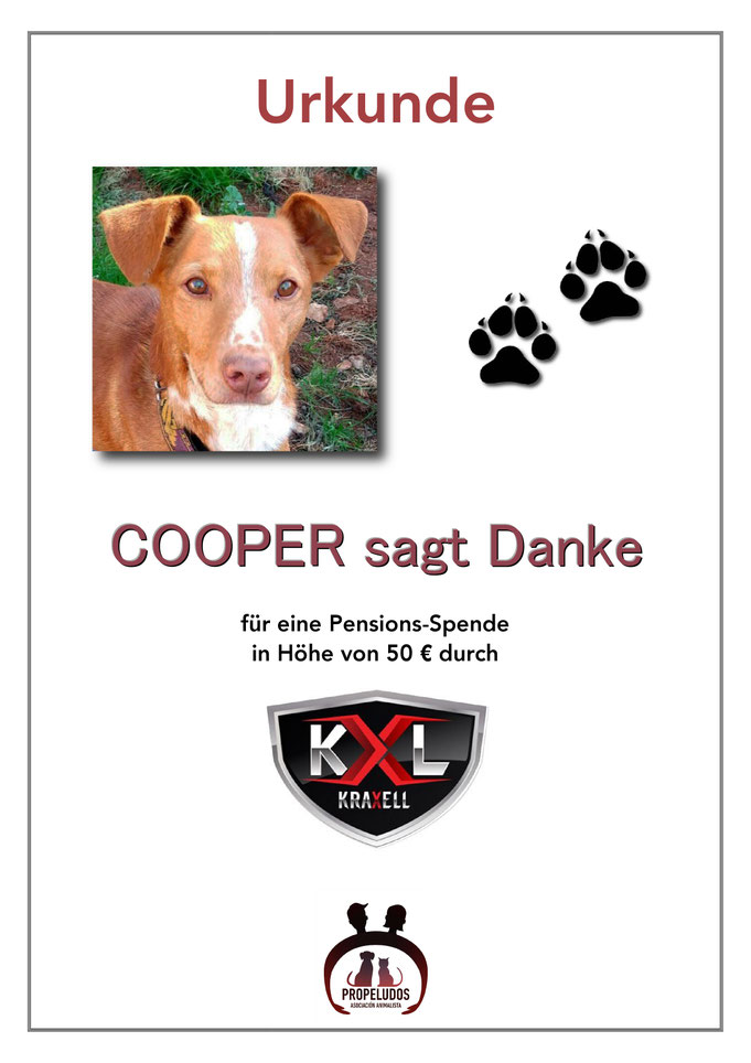 Obwohl Cooper so ein hübscher, kecker Bursche ist, hat er kein Glück. Er hat keinerlei Anfragen von Interessenten, die ihm ein Zuhause geben möchten. Und auch hier findet sich niemand, der eine Patenschaft für ihn übernehmen möchte. Einzig und allein durch einzelne Direktspenden, Spenden aus Einkäufen und dank der ihm zugeteilten Spende in Höhe von 50 € aus dem Charity-Event, das Kraxell zugunsten unserer SOS-Tierschutzprojekte veranstaltet hat, stehen mittlerweile insgesamt 115 € für Cooper zur Verfügung.
