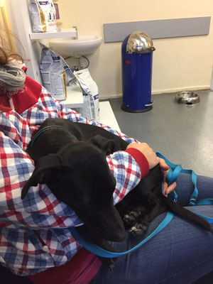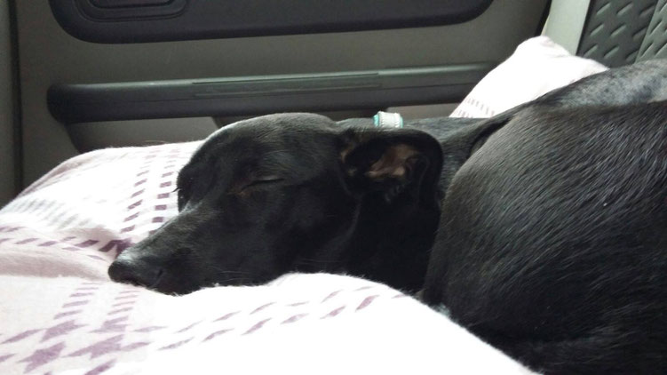 Wie auf dem Foto unschwer zu erkennen ist, war die Untersuchung für Frieda sehr anstrengend. So musste die Rückfahrt von der Klinik nach Hause für ein Nickerchen genutzt werden.