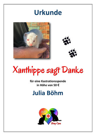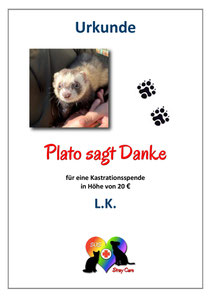 Die Frettchen Xanthippe, Socrates und Plato haben über unser SOS Stray Care Projekt 121 für den spanischen Verein The Animal Collective ihre Kastrationsspenden gefunden.