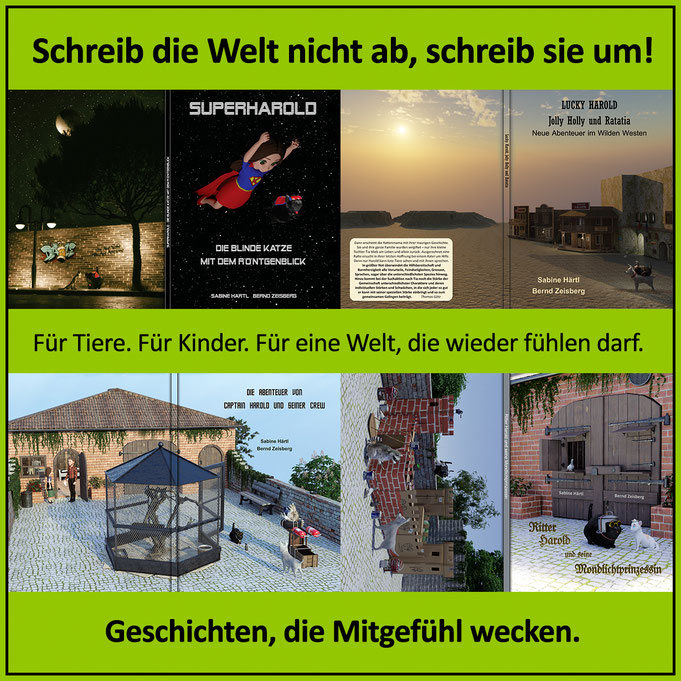 Alle Teile der Geschichten um den blinden Kater Harold und seine zwei- und vierbeinigen Freunde sind jetzt in unserem Onlineshop auf der Seite Bücher für den Tierschutz zugunsten unserer SOS-Tierschutzprojekte als Hardcover- Ausgabe oder E-Book erhältlich.