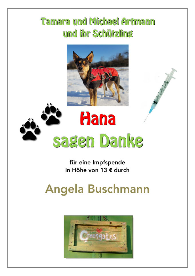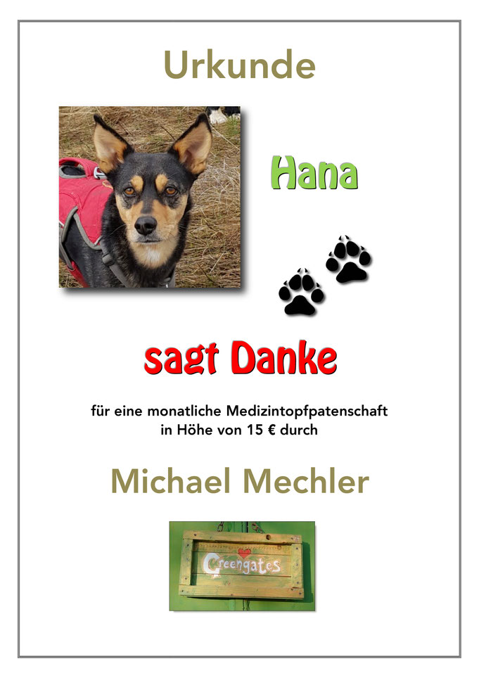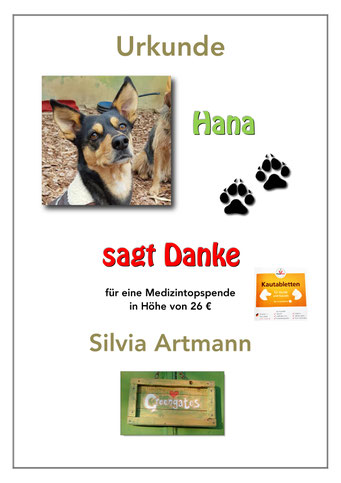 Da Hana regelmäßig das Medikament zur Linderung ihrer Arthrose benötigt, haben wir für sie eine Medizintopfpatenschaft eingerichtet. Somit sind die Kosten für die Versorgung mit dem Medikament