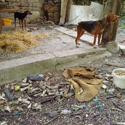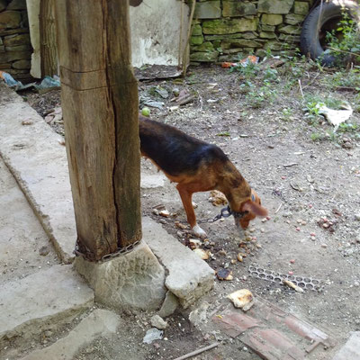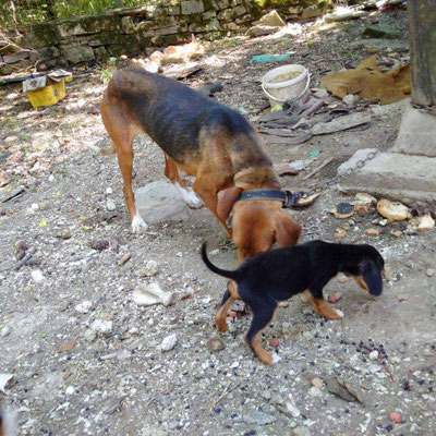 nicht tat. Als wir auf die kleine Gruppe aufmerksam wurden, waren die beiden erwachsenen Hunde unter einem Scheunendach an kurzen Ketten, hatten fauliges Wasser in einem Eimer und tonnenweise