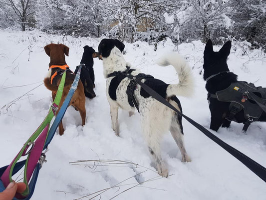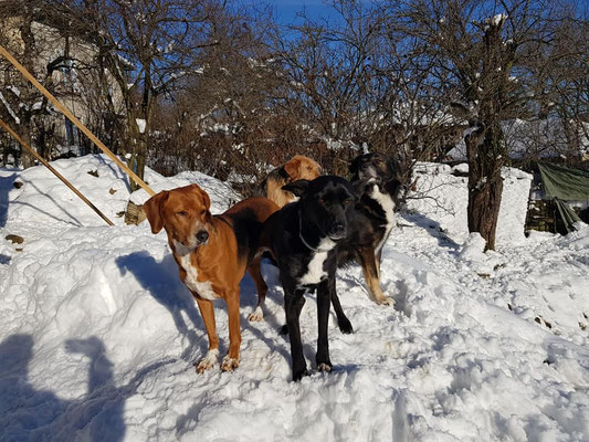 Nach langen drei Monaten konnten wir den Junghund Mishka (links und Mitte), Pita - den schwächsten der Welpen - und Penny (ganz rechts) endlich freibekommen. Die beiden anderen Welpen hat