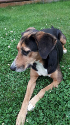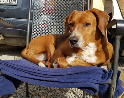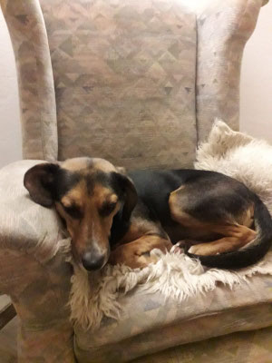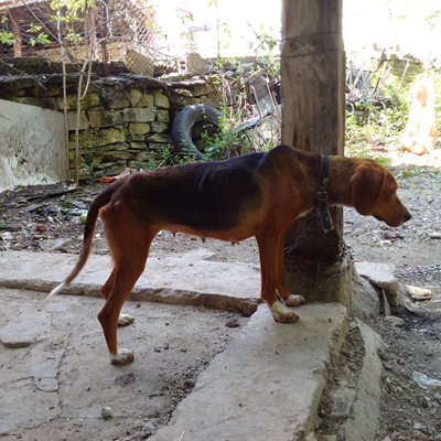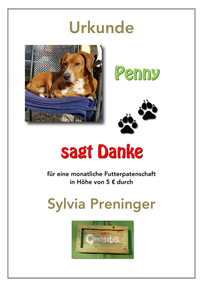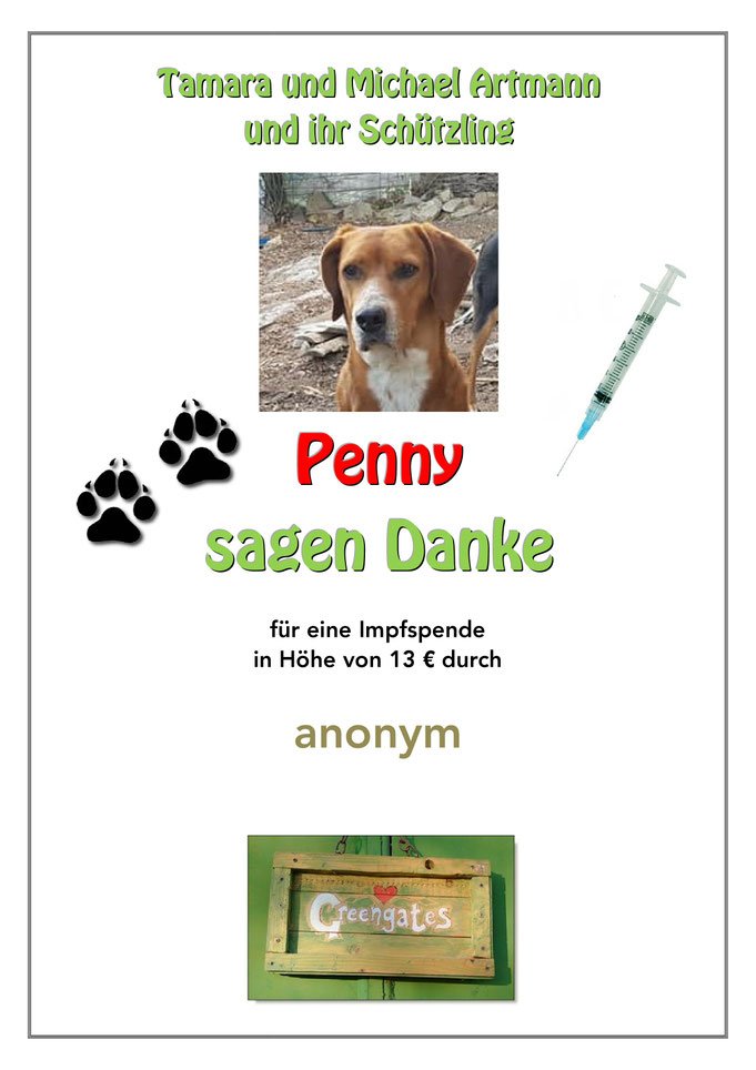 Penny wurde zusammen mit drei Welpen und einem Junghund von einem Jäger, der aus dem Dorf weggezogen ist, zurückgelassen. Ein Nachbar sollte sich um die fünf kümmern, was er aber