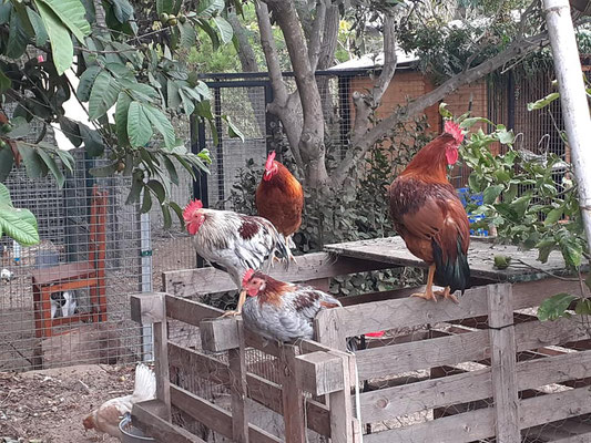 Im Südbereich der Rettungsstation haben viele Hühner und Hähne ihr Zuhause gefunden – begleitet von einigen Enten, die das Gelände mit Leben erfüllen. Rund 50 Tiere scharren, gackern und schnattern hier, verteilt ums Haus, wo sie in kleinen Gruppen ihren Alltag verbringen. Ob beim Staubbad in der Sonne oder beim neugierigen Blick durchs Gras – jedes Tier hat seine eigene Geschichte und seinen eigenen Charakter.