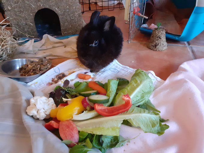 Derzeit musste sie leider wieder in Quarantäne, da sie sich als einzige unter den Kaninchen mit Pilzen infiziert hat. Da die anderen sechs Mitbewohner keine Anzeichen einer Pilzinfektion zeigen,
