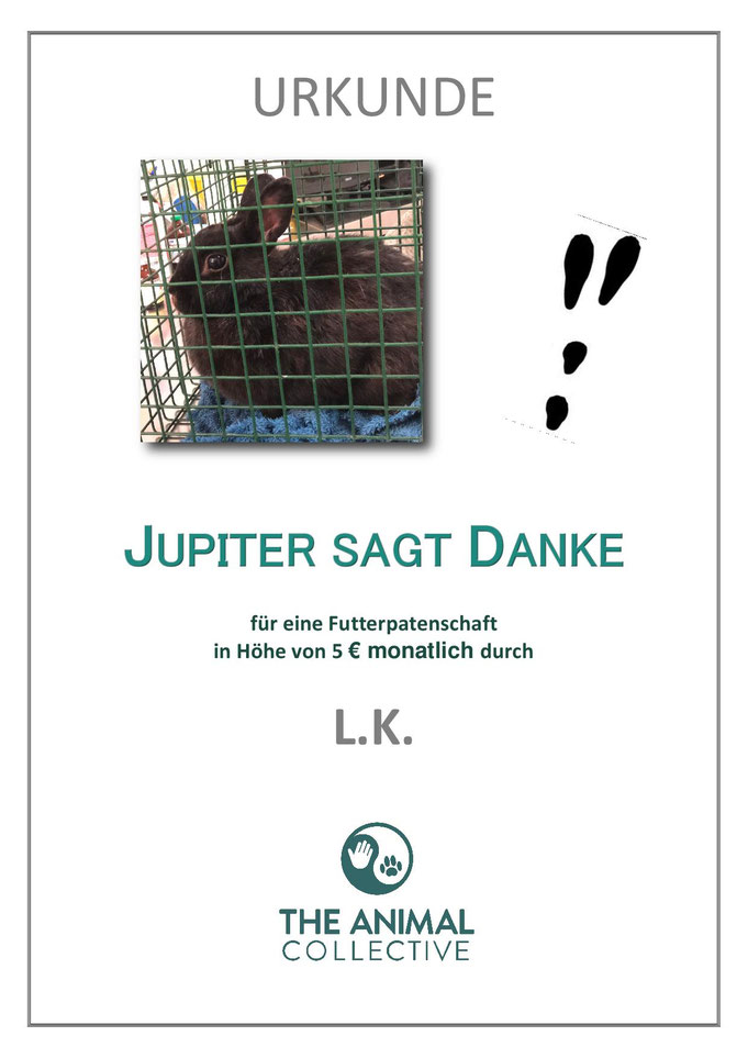 Jupiter wurde Anfang November 2022 in der Rettungsstation von TAC aufgenommen. Sie wurde in einem vollig verschmutzten Käfig in der Näher einer Katzenkolonie ausgesetzt. Es war nicht ganz sicher, ob sie überhaupt überleben würde. Ihr ganzer Körper war voller Infektionen. Zweimal täglich musste Eiter aus ihrem Körper entfernt werden und sie erhielt Antibiotika und Vitamininjektionen. Sie ließ alle Prozeduren tapfer immer über sich ergehen. Stück für Stück erholte sich das Kaninchenmädel und ihr Fell wuchs wieder nach.