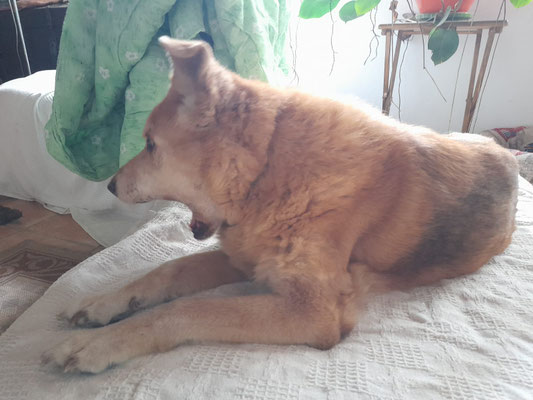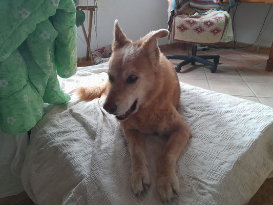 Ruscko bellt häufiger, da er nicht aufstehen will, aber wissen muss was gerade passiert und wer da so ist. So hält er gerne Hof und genießt die Extra Streicheleinheiten.