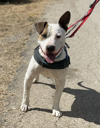 Der 60 cm große American Staffordshire Terrier steckt voller Energie und Lebensfreude – doch die letzten zwei Jahre musste er in einem engen Käfig verbringen, was ihm sichtlich zugesetzt hat.
