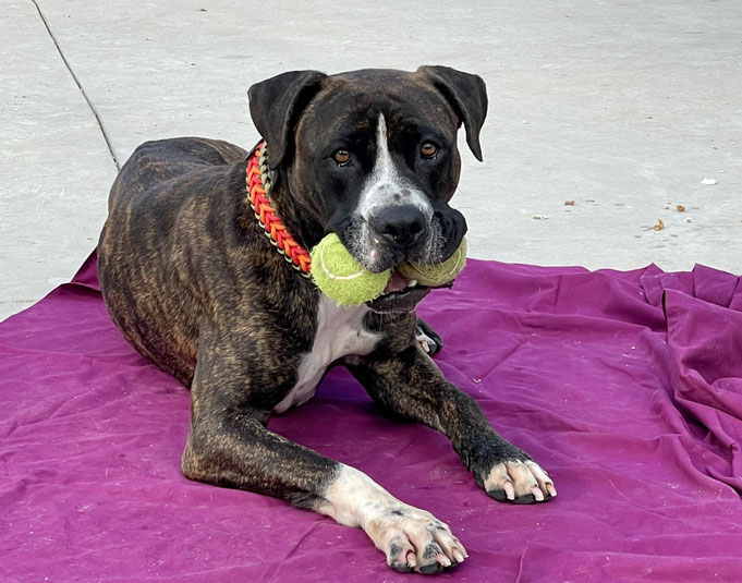 Ein echtes Highlight für Owl sind seine geliebten Bälle – er kann sogar drei gleichzeitig im Maul tragen! Doch trotz seines verspielten Wesens musste er zwei Jahre in einem engen