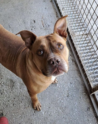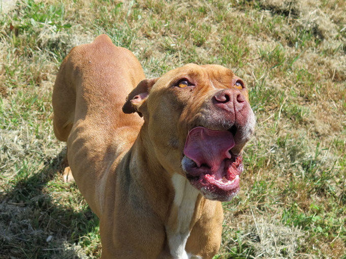 Die Staffordshire Bullterrier-Hündin ist eine besondere Seele – sie knüpft nicht sofort Bindungen, doch wenn du ihr einen Ball wirfst, leuchtet ihr Gesicht vor Freude auf.