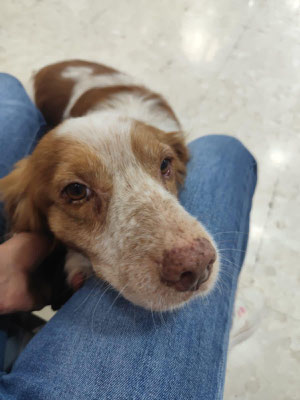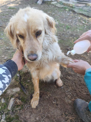Tierarzt muss natürlich auch manchmal sein. Aber die meisten Hunde sind mit Inmas Hilfe ganz tapfer! Hier sind Charly bei der Blutentnahme zu sehen und Rufo, dessen verletztes Auge tierärztlich versorgt werden musste.