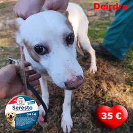 Als Deirdre zusammen mit ihrem kleinen Freund in der städtischen Auffangstation aufgenommen wurde, war sie sehr ängstlich. Das verschlimmere sich, als ihr Freund adoptiert wurde und sie allein zurückblieb. Als sie in in die Obhut des Vereins Animal Angel Global kam, war sie immer noch etwas nervös. Mittlerweile ist sie aber richtig aufgeblüht, spielt mit allen Hunden und ist die Erste, die auf die Wiese los rennt. Sie hat viele Freundschaften geknüpft, aber hat auch viele Freunde gehen sehen - sie bleibt immer zurück, da es leider keine Anfragen für sie gibt. Auch diese süße Maus würde sich über ein Seresto-Halsband freuen!