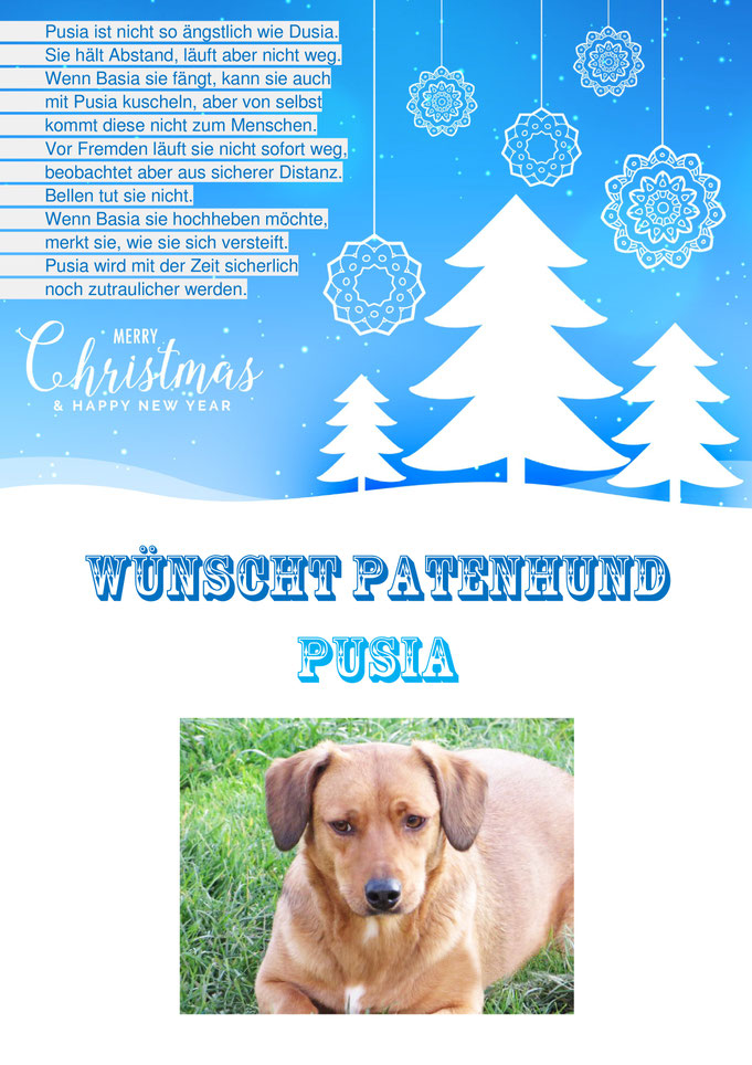 Pusia halt leider Angst vor Fremden und bleibt auf Distanz. Auf Basia und ihre Familie kommt sie auch nicht zu, lässt sich aber von ihnen auf den Arm nehmen. Sie ist bereits sterilisiert.
