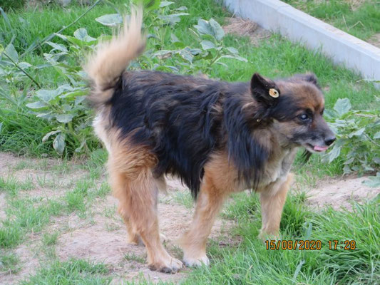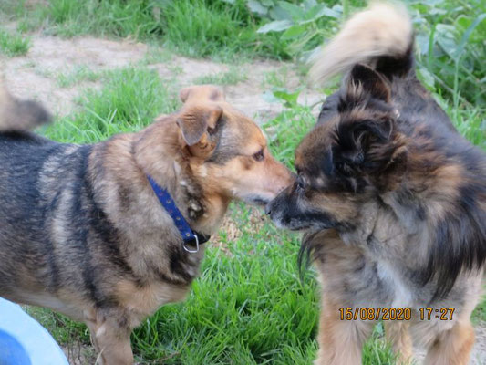 Zudem zeigt er sich Menschen - besonders Männern - gegenüber ängstlich. Mit Hundedamen verträgt er sich ganz gut, mit Rüden, z.B. dem großen Hund Maks nicht so gut.
