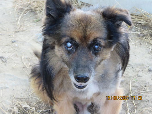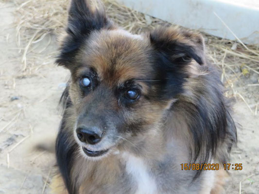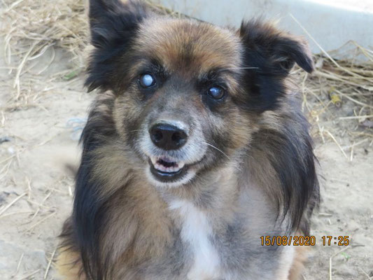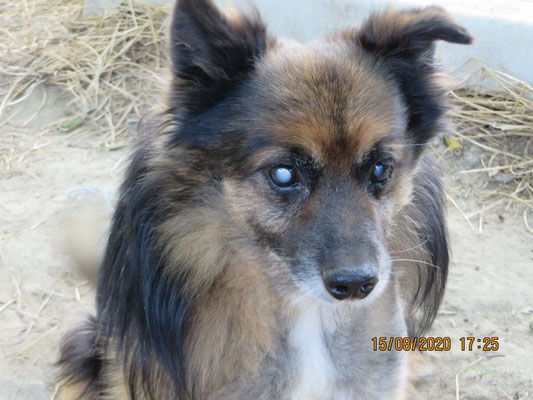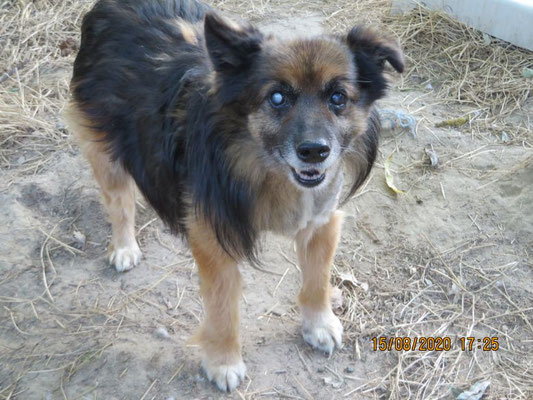 Tadziu ist schon ein älterer, blinder Hund, sein Alter wurde auf 10 Jahre geschätzt. Auf einem Auge hat er noch etwas Sehfähigkeit.