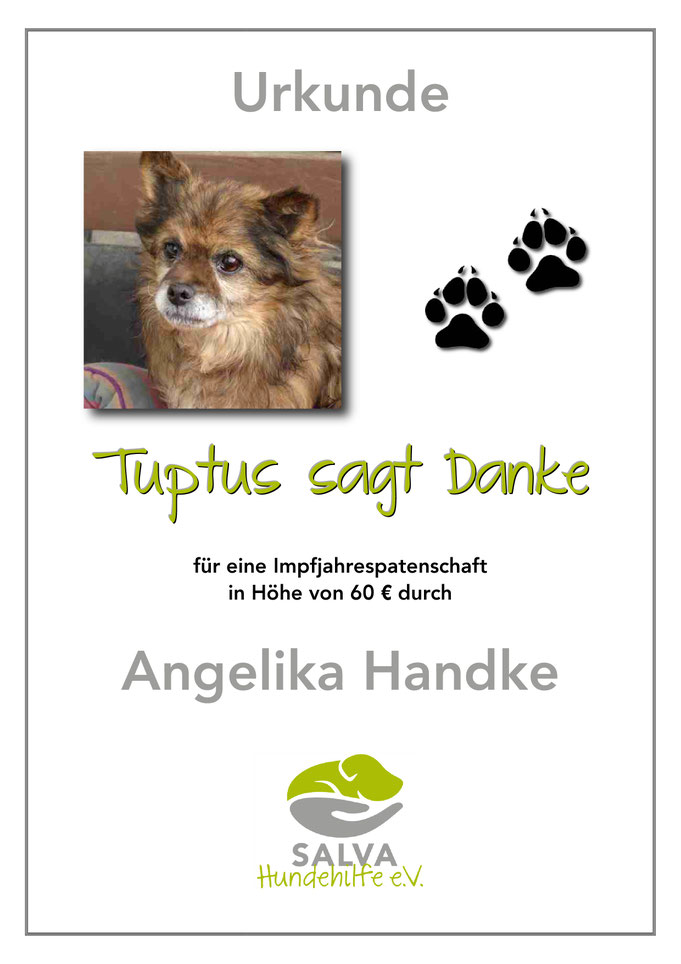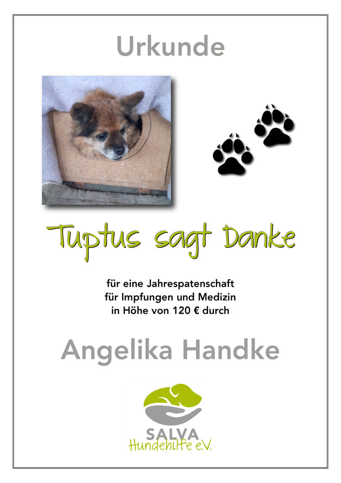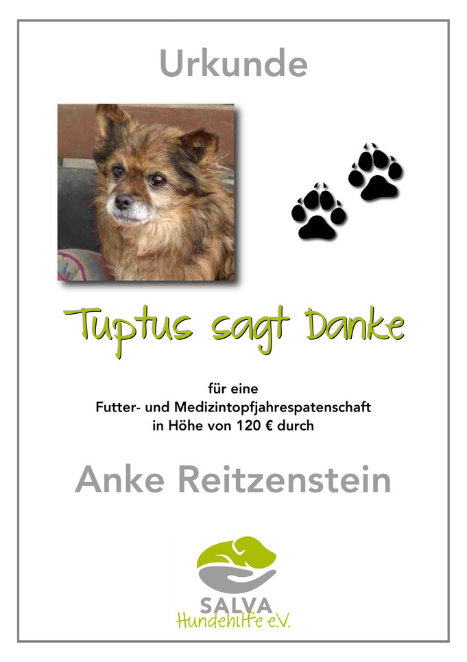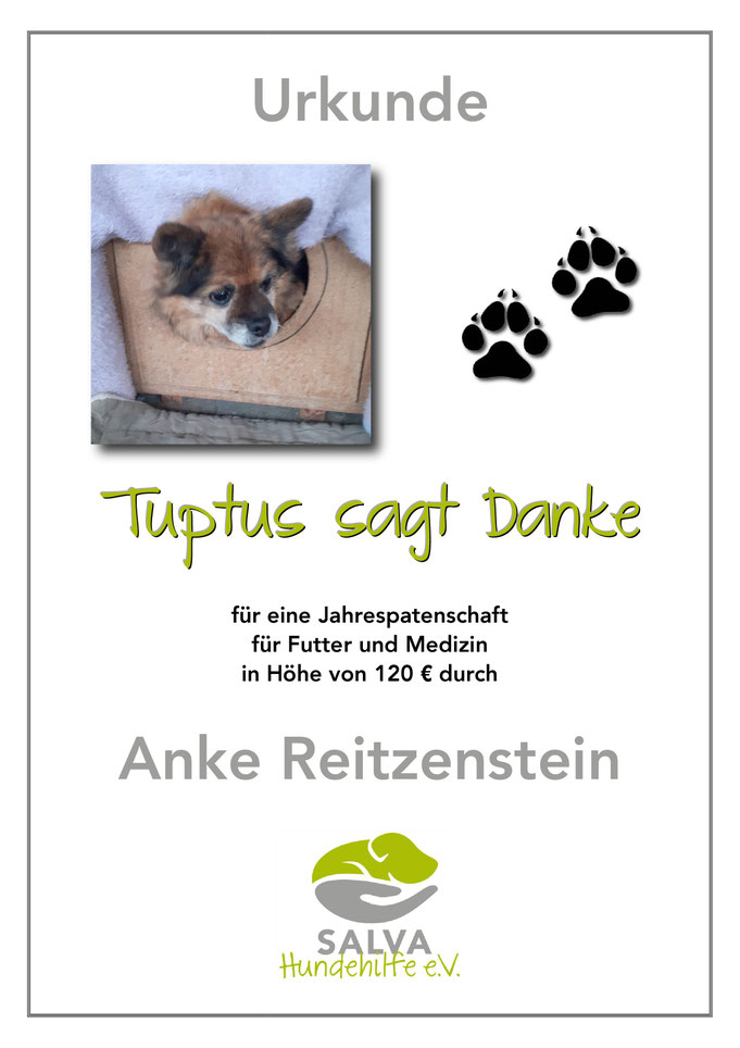 Tuptus wurde in eine Auffangstation gegeben, dort drohte ihm aber die Abschiebung in ein Tierheim, das einen sehr schlechten Ruf besitzt. Dort hätte er kaum eine Überlebenschance gehabt.