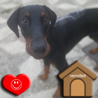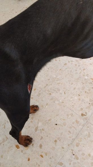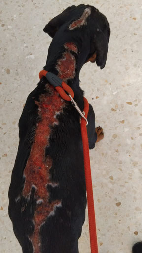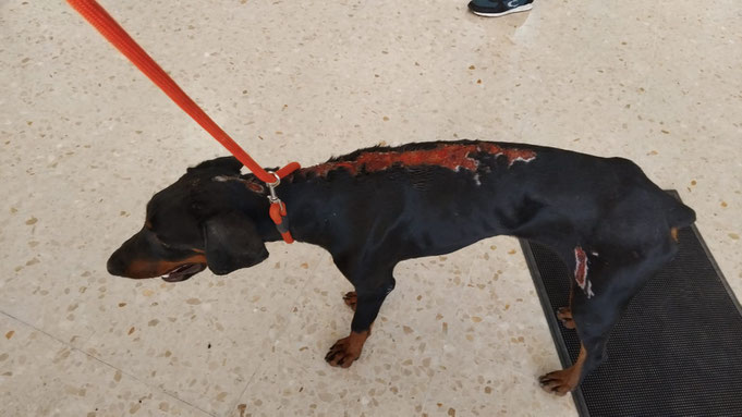 Der misshandelte Dobermannrüde darf zu seiner neuen Familie ausreisen. Seine Verätzungen sind gut verheilt, sogar das Fell wächst bereits nach. Wir