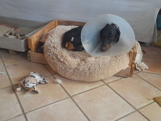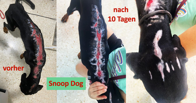 Leider begann Snoop Dog sofort, an der Wundnaht zu lecken, weshalb er nun eine ungeliebte Halskrause tragen muss. Das bremst seinen jugendlichen Übermut etwas aus – sehr zur Freude der anderen Hunde, die sich über eine kleine Verschnaufpause vom temperamentvollen Energiebündel nicht beklagen.