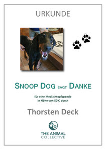 Ab August 2025 hat Snoop Dog eine Futterpatin, die ihn bis zu seiner Vermittlung monatlich bei seiner Versorgung unterstützt.