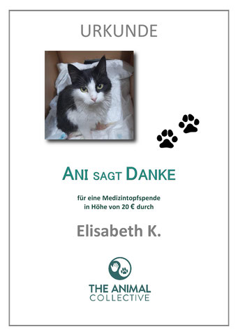 Dank zwei weiterer Spenden ist der Medizintopf der gelähmten Handicap-Katze Ani auf 222 € angewachsen. Im Namen des spanischen Vereins The Animal Collective ein ganz dickes