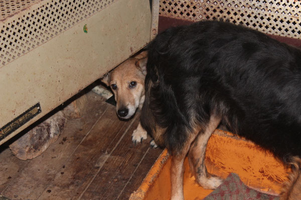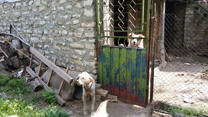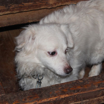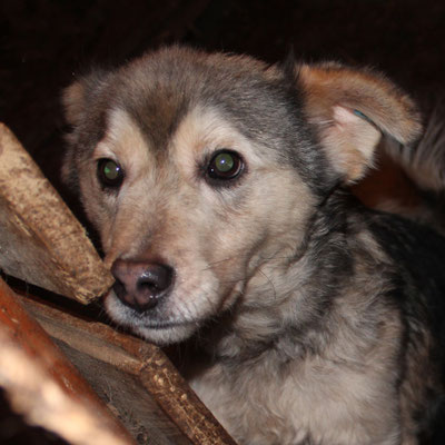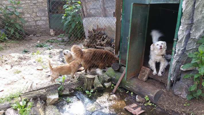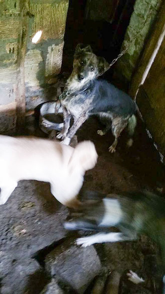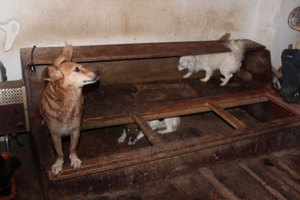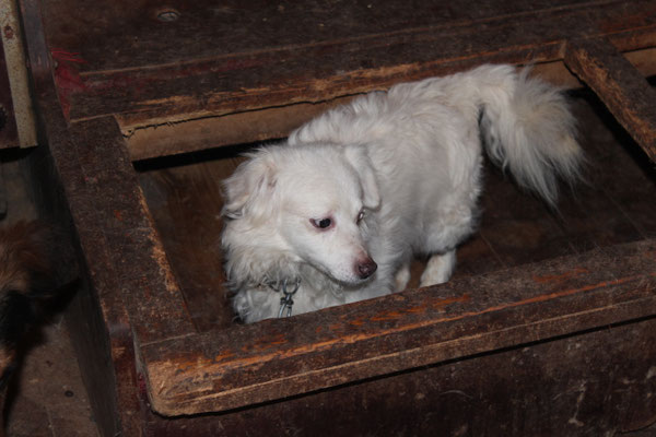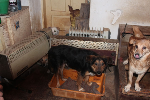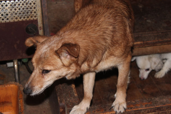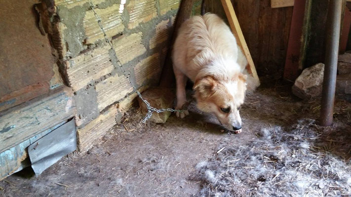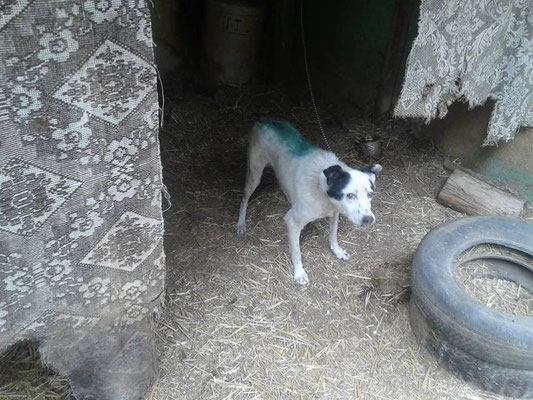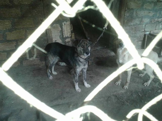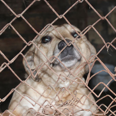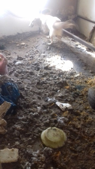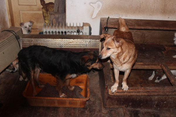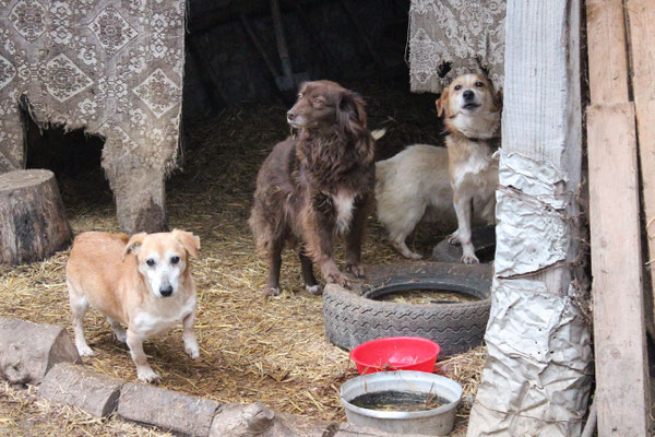 "Selbst die Hunde, die draußen untergebracht sind, leben wie Schweine im Stall… Dort gibt es z.B. zwei Hunde, die in einem großen Kasten für Mais leben! Zwei Hunde auf 1,5 m²… einer von ihnen leidet schon seit langem an Demodikose und einer Ohrenentzündung und ist völlig abgemagert… ihn habe ich schnellstmöglich medizinisch erstversorgt."