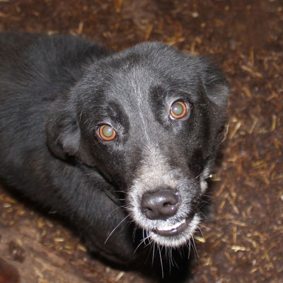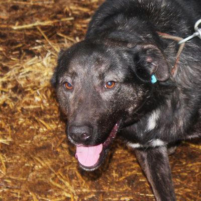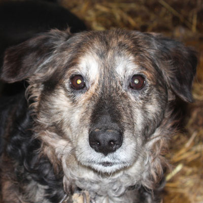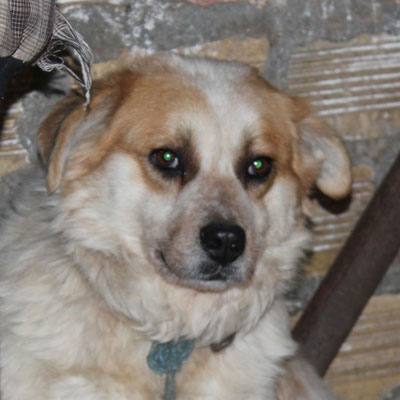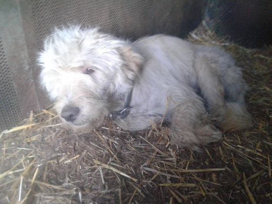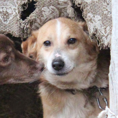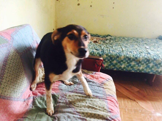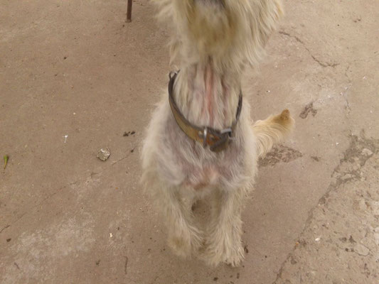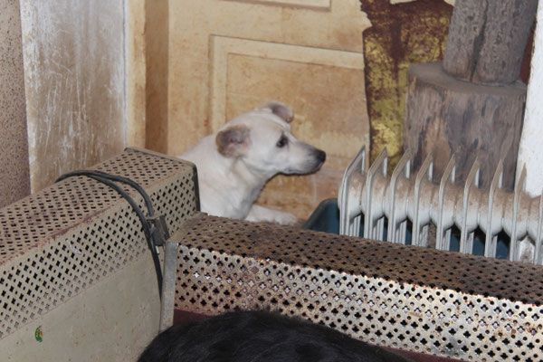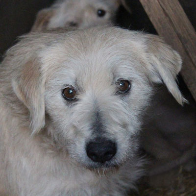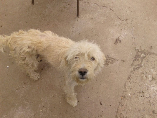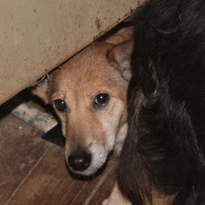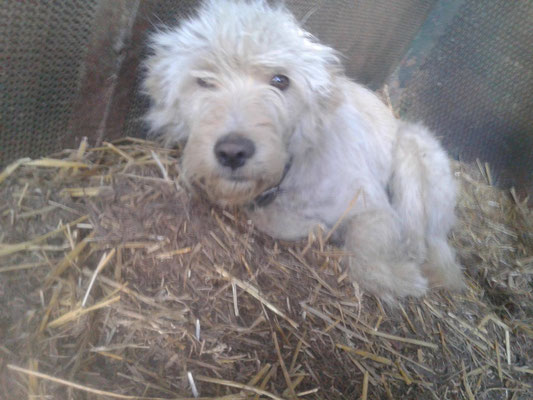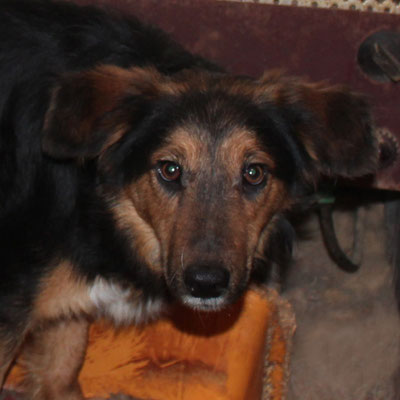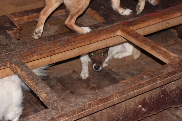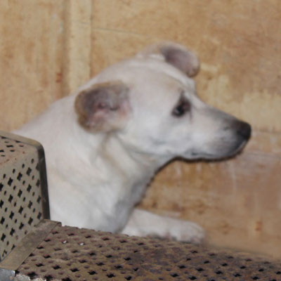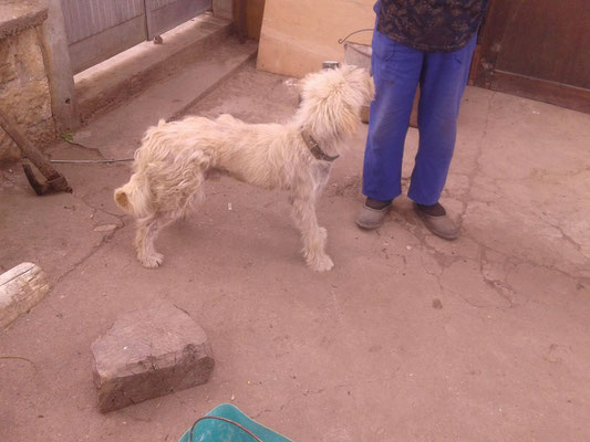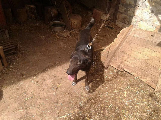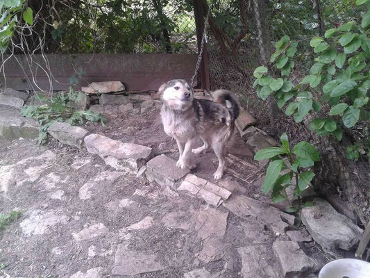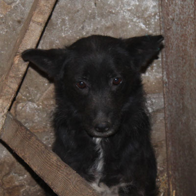 "Selbst die Hunde, die draußen untergebracht sind, leben wie Schweine im Stall… Dort gibt es z.B. zwei Hunde, die in einem großen Kasten für Mais leben! Zwei Hunde auf 1,5 m²… einer von ihnen leidet schon seit langem an Demodikose und einer Ohrenentzündung und ist völlig abgemagert… ihn habe ich schnellstmöglich medizinisch erstversorgt."