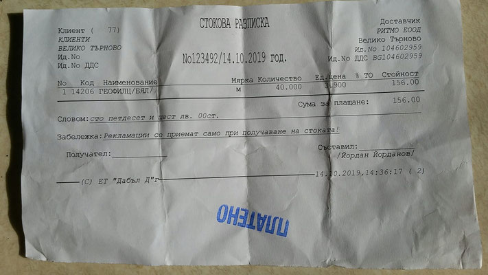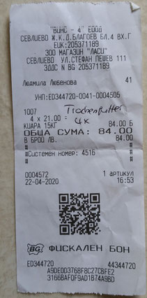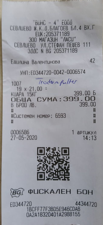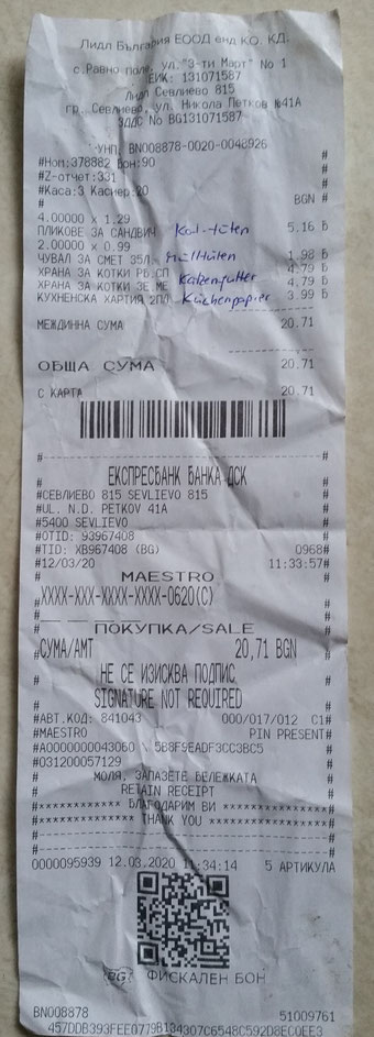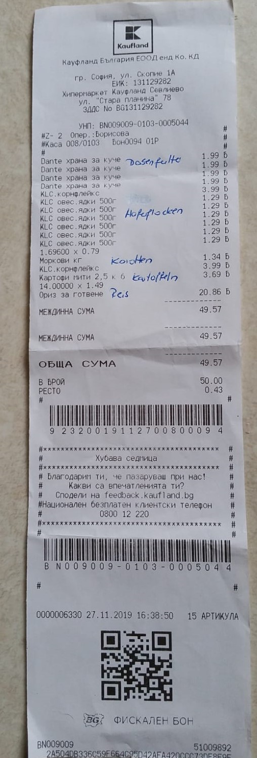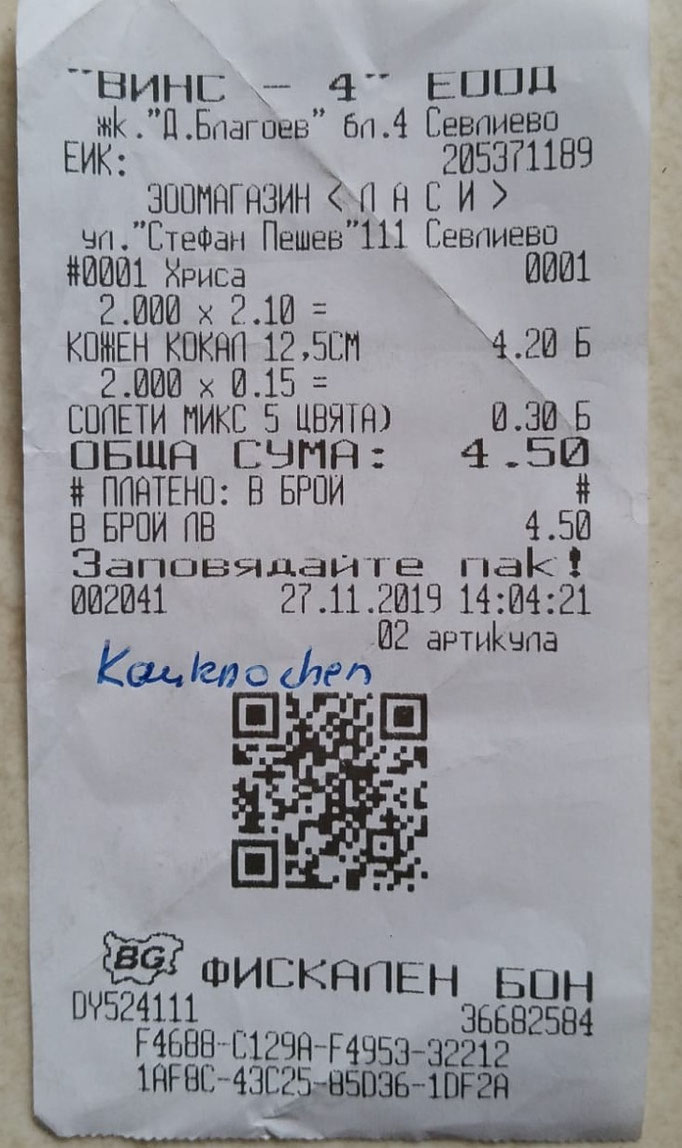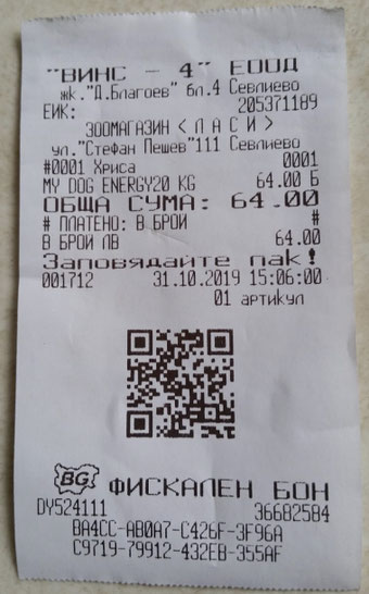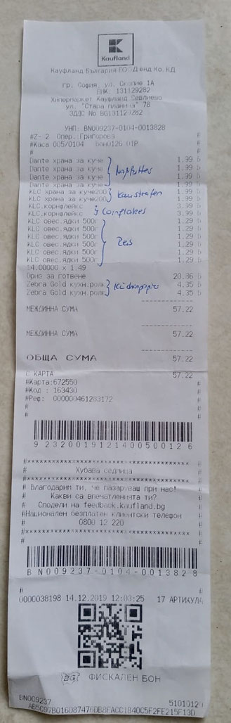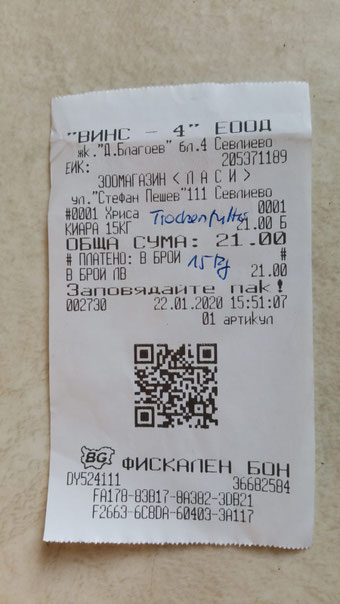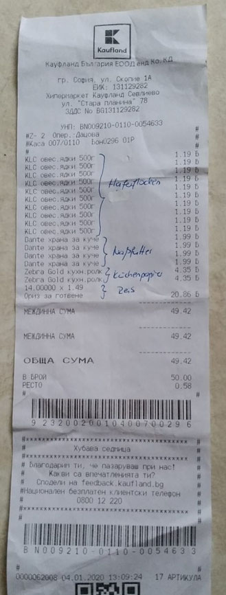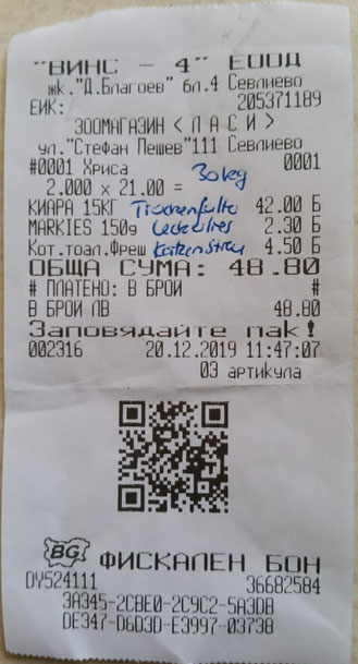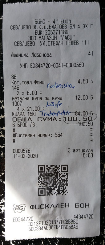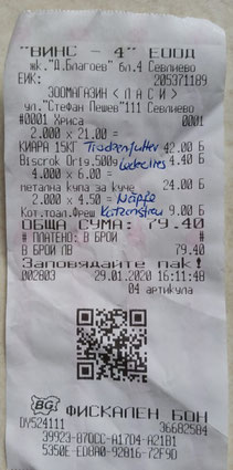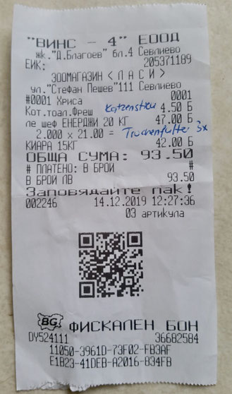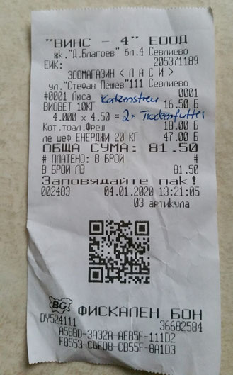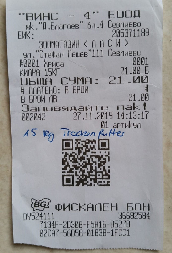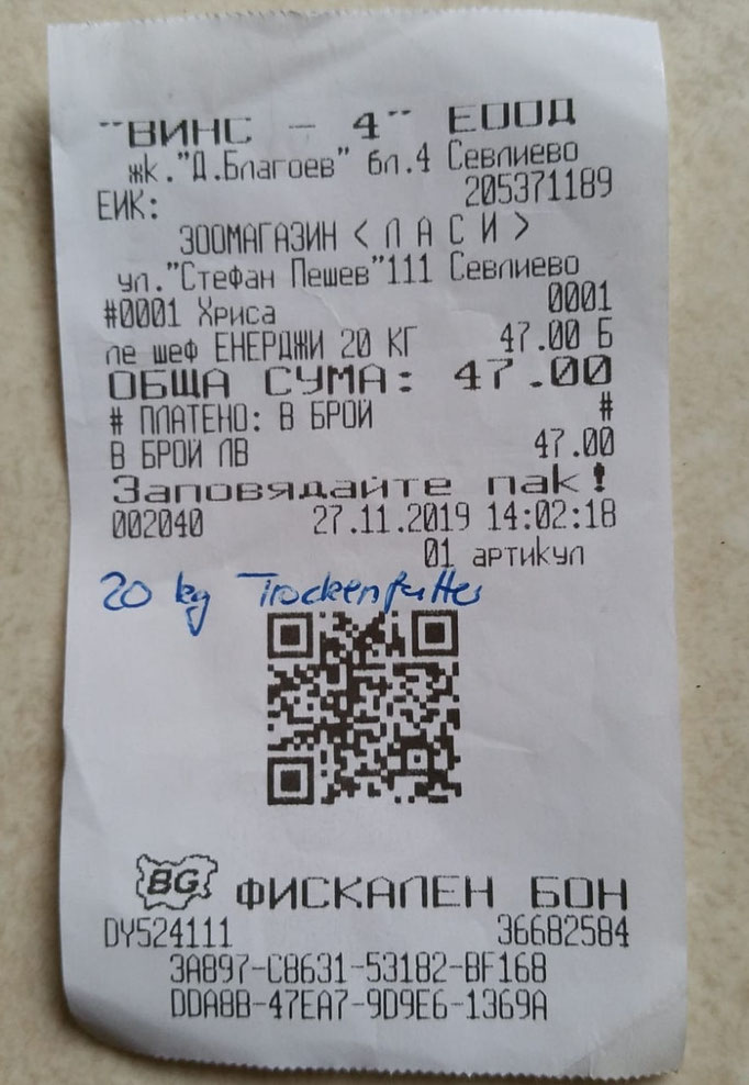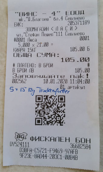 Quittung über 20 kg Trockenfutter
