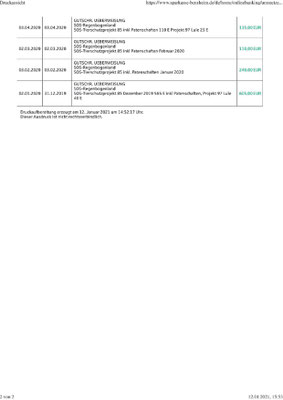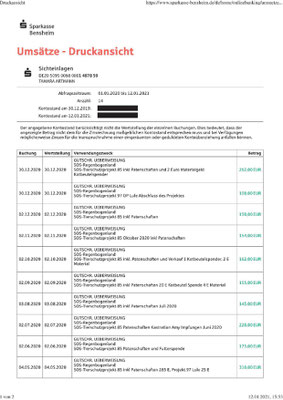 Beleg über die im Jahr 2020 bei Greengates eingegangenen Zahlungen von SOS-Regenbogenland