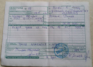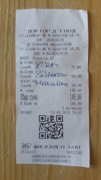 Quittung des Tierarztes über die Abgabe von Medikamenten für die Sedation für die Kastration von Monty