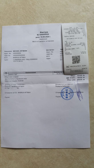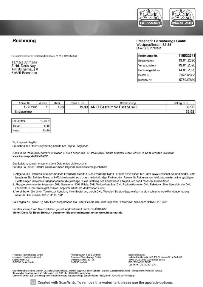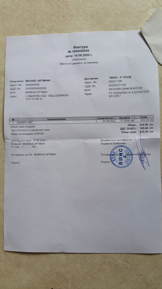 Rechnung über 30 Sack Trockenfutter vom 19. August 2020 nebst Zahlungsbeleg