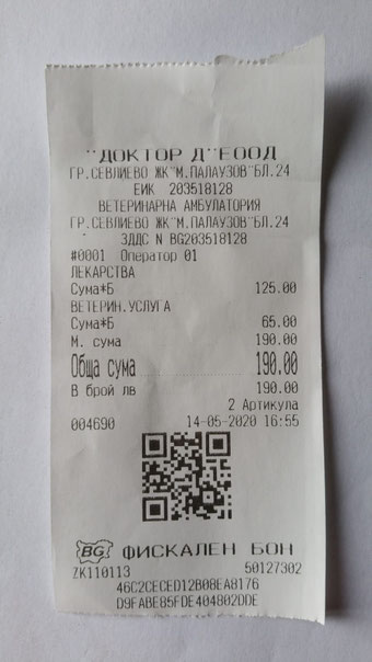 Zahlungsbeleg über Kastration Amy und Impfstoffe vom 14. Mai 2020