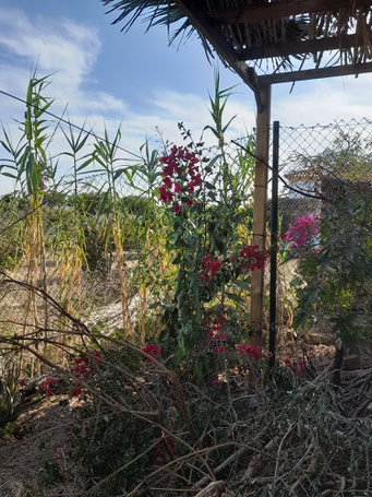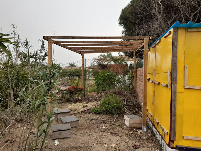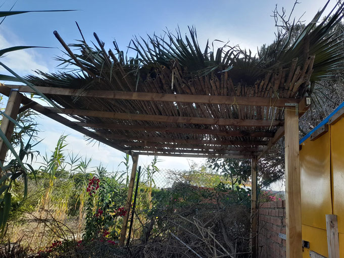 Vor knapp drei Monaten wurde die Pergola als feste Überdachung der kleinen Igelstadt montiert. Mittlerweile hat sie ein natürliches Dach aus Bambusstangen und Palmwedeln erhalten und in der