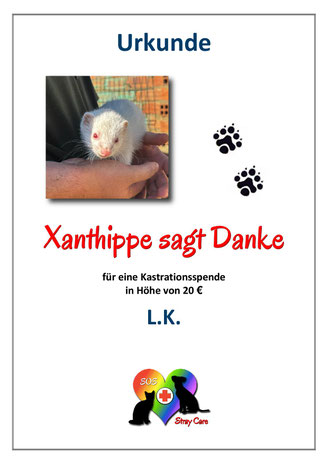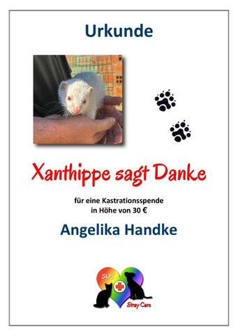 Frettchendame Xanthippe hat über unser Kastrationsprojekt 121 eine Kastrationsspende erhalten. Im Namen des spanischen Vereins The Animal Collective geht ein